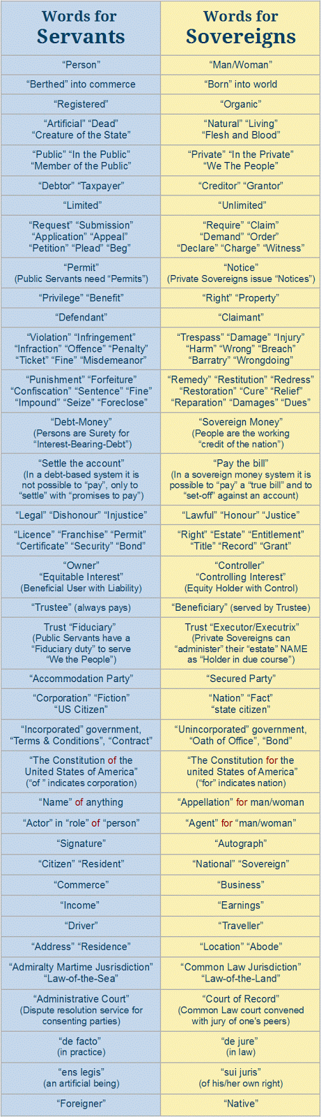 The systemic and repeated use of servile words conditions a population to accept and practice servile behaviour. We the People are taught to “submit”, “petition”, and to “appeal” to our Public Servants. We are not taught the critical difference between a “person” and a “man” or “woman”. Nor are we taught that the “Law of the Sea” refers only to legal fictions in Admiralty Maritime Jurisdiction – serving commerce, while the “Law of the Land” refers to lawful facts in the Common Law Jurisdiction – serving men and women.