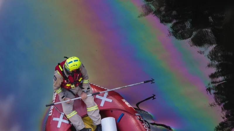 Containment booms were set up to prevent the oil from moving up or downstream, and skimmers were used to remove the contained oil the next morning.